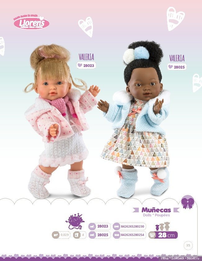 У меня тоже есть Llorens (вряд ли теперь переучусь на новый лад) -это две куклы Мариэль — одна шатенка с ярко-бирюзовыми глазами (очень красивая), и милейшая блондиночка с карими -точь в точь, как на фото в начале топика с сайта «Ладошки.ру». Обеих куколок покупала в 2011 году. Очень приятный, бархатистый винил и милые мордашки)