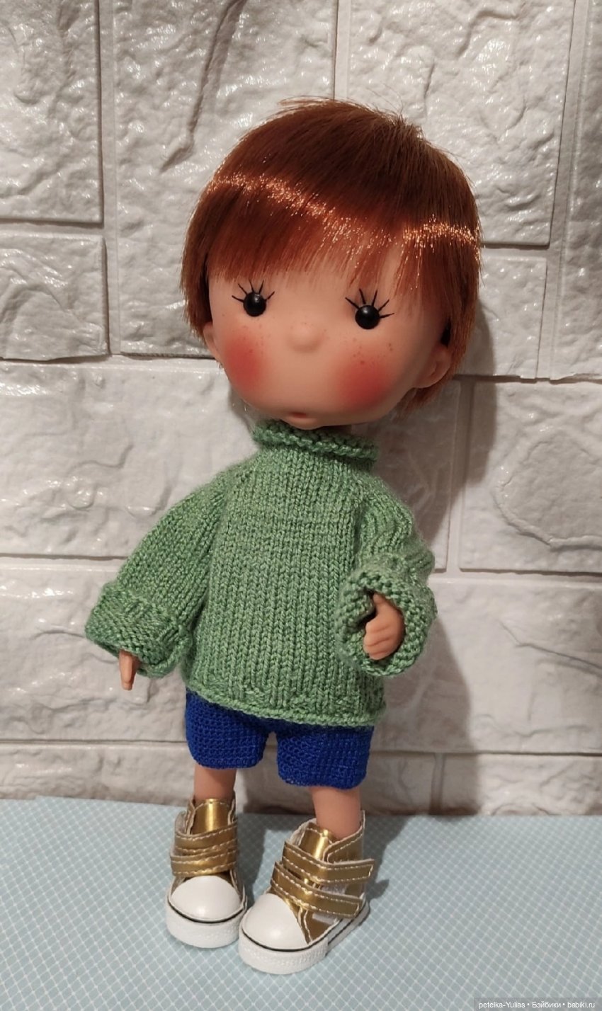 Шортики вязала специально для него, но они еще не закончены. Почему-то я совершенно забыла, что на полке стоит коробочка с недовязами🤭Свитерок позаимствовали из гардероба Паолочек.Правда пришлось его сзади сколоть булавками, т.к. размерчик не тот.