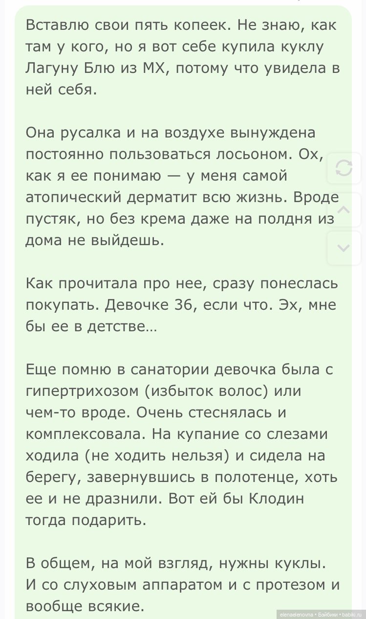Я, как родитель, вольна использовать любые удобные и доступные для меня способы объяснения. Я могу столкнуться с ребенком с витилиго/дцп/синдромом Дауна, а могу не столкнуться с этим ни разу — и объяснить через куклу. Чем вам это мешает? почему вы ограничиваете меня в способах? Почему вы считаете, что я заменяю человеческие отношения суррогатом🤔? А вы специально выискиваете детей с разными особенностями на площадках, чтобы показать ребенку «вживую»? А в таком случае чтение историй о дружбе и предательстве (например) — это замена реалий суррогатом? И почему вы считаете, что игра с куклами подменяет, а не дополняет/обогощает реальность?