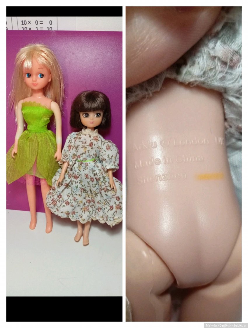тут я ее сфотографировала с винтажной Ликой для сравнения размеров и клеймо. Волосы были длинные, но клочками выстрижены, подровняла в каре