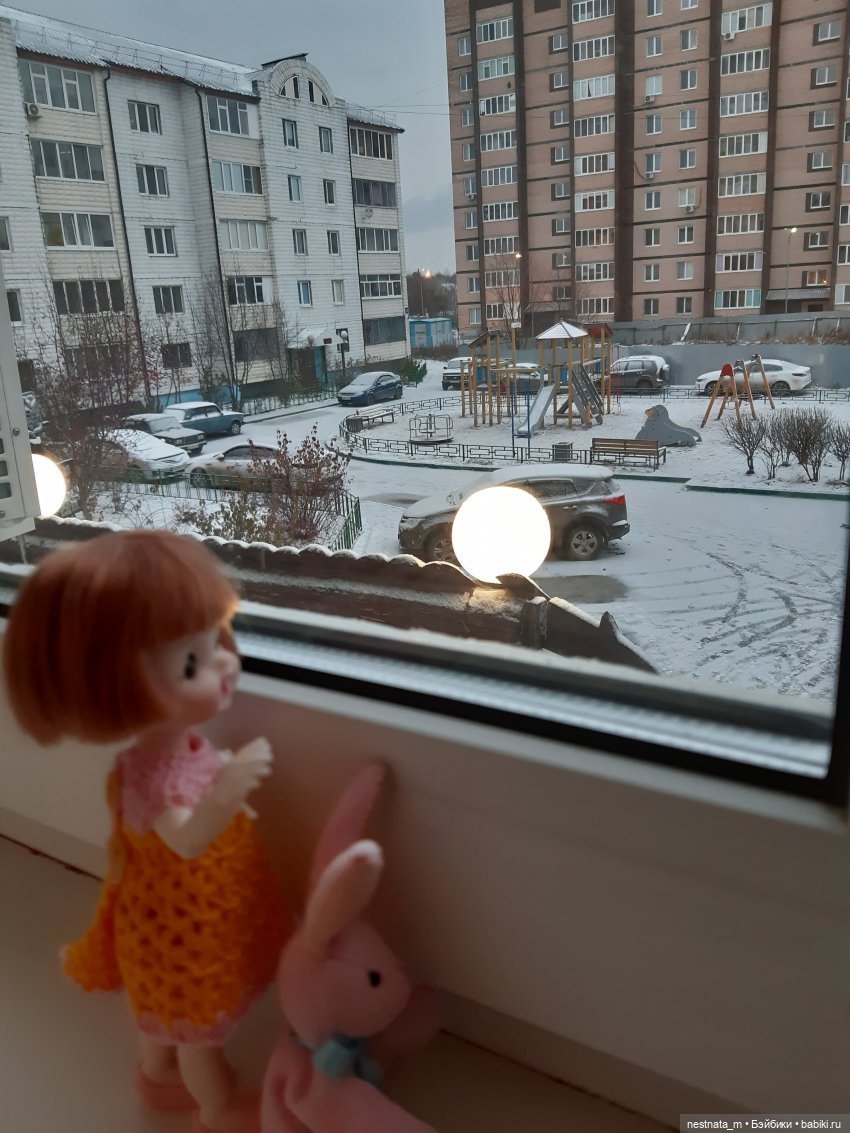 А мы не отмечаем Хелуин.У нас снежок выпал! Как тут не попроситься на улицу.Мы с Анюткой быстро оделись и побежали.Она Тимку выгуливать, а я Бобика своего.Снежок лежал тонким слоем и на дорожках и на траве.Мы забрались на пенёк и сидели разговаривали.Ну вроде мы взрослые.Анютка жаловалась, что Тимка спит только на улице, а я говорила как воспитываю Боба.Потом переключились на наши кукольные дела.Грустно по долгу сидеть в шкафу.Маме всё некогда и некогда! Редко приходит в гости.А уж когда наряд последний нам делала и вовсе не помню.Анютка тоже вздыхала и поддакивала.У нее и вовсе своих нарядов не было.Все мои донашивает.И наряды и игрушки.Гуляли мы гуляли, а потом мама нас домой забрала.Вот такая коротенькая история.)