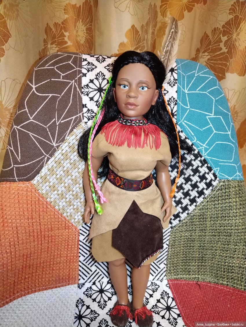 Судя по описанию, девушка принадлежит племени Хупа. Однако отмечу, что оригинальный костюм совершенно не соответствует традиционной одежде данного племени и является скорее фантазией на тему индейского костюма.