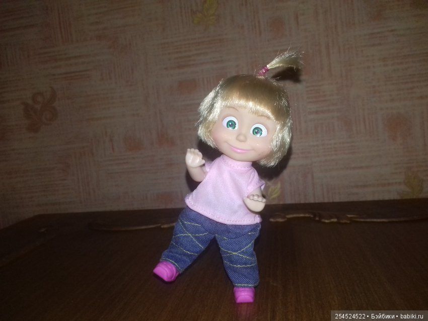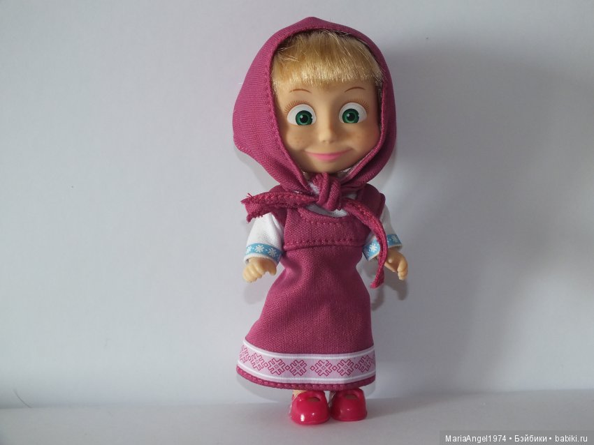 Сознаюсь, Маша мне не нравилась. Из-за личика, вернее, из-за глаз, которые создают впечатление девочки с приветом. Но решила все же такую куколку поселить у себя, все-таки персонаж из отечественного мультфильма, к тому же люблю маленьких кукол. И недавно посетила Детский Мир, купила себе несколько кукол, в том числе выбрала Машу. Хотелось с глазками, смотрящими прямо и с хорошими волосиками. Выбрала, насколько это возможно, не распечатывая коробочки с куклами. Понравилась Машка в фуражке и на велосипеде. Но в итоге выбрала эту, в платочке и сарафанчике.
