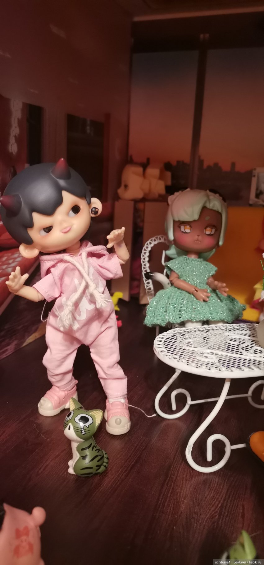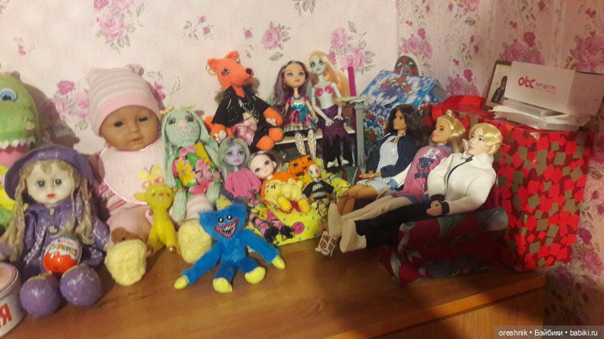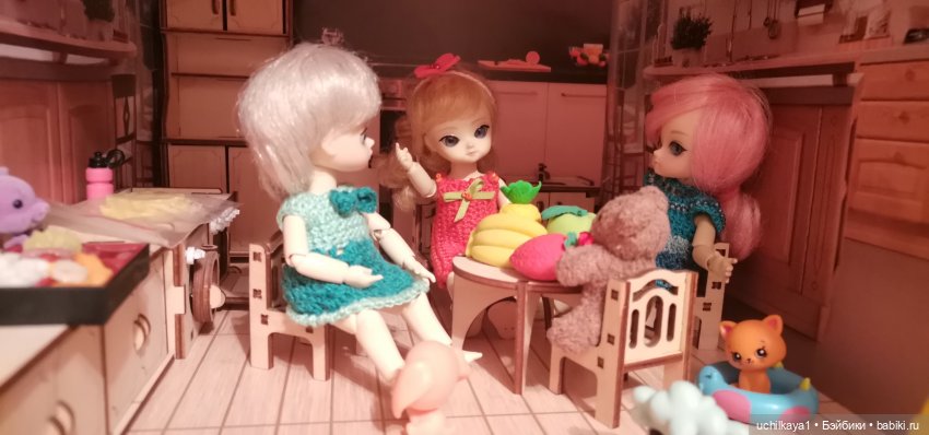 Мои жители на комоде живут, в тесноте, да, не в обиде) у старших свой диван. У Яны, Твайлы и ещё к ним повязунчики подсели тоже есть свой. А Эйлин с Мэделин сидят на игрушечном самодельном столе, потеснив Лису и Зайку. Нашла фото, практически так же сейчас они сидят