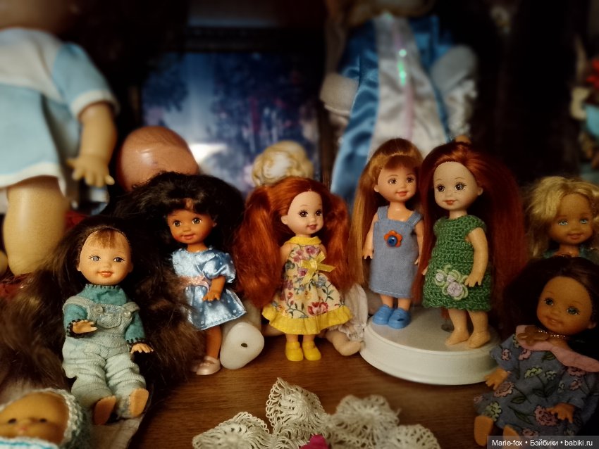 Ведь как рассуждаешь — они же маленькие, много места не занимают, подумаешь, ещё 1, 2, 3… куколки. А потом бац! и за год их уже больше 50-ти))) И это только именно Келли/Томми. А с ними за компанию просочилась толпа малышей с молдированными волосами из разных наборов (на фото только часть, сейчас их в два раза больше):