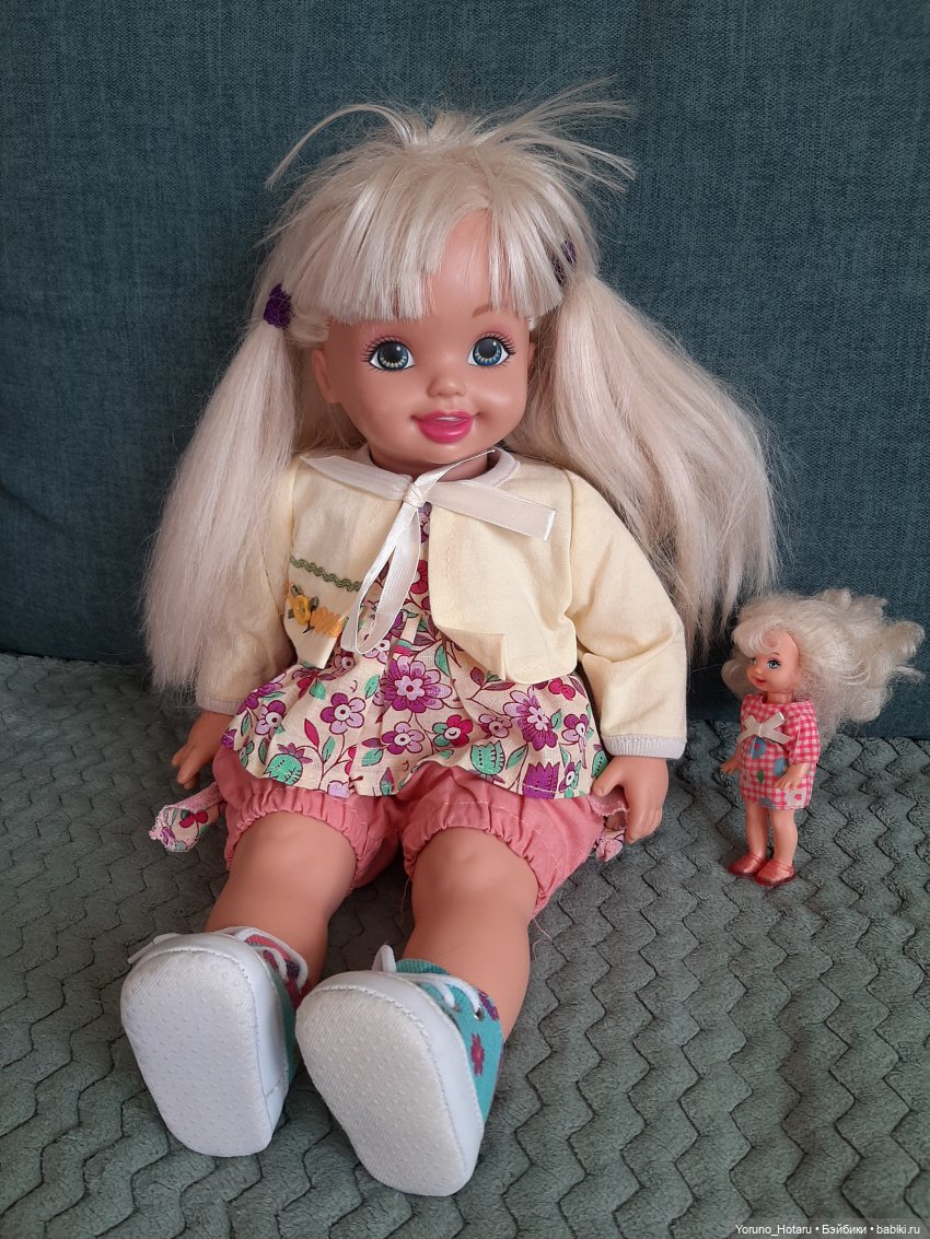 Всем добрый день! Наконец-то я добралась до одной из самых любимых куколок в моей коллекции — большой мягкотелой куклы Holiday Kelly, выпущенной Mattel на Рождество 2000 года. Келли — самая младшая сестра куклы Барби всегда выпускалась в маленьком формате, но в начале 2000-х годов Mattel решились на эксперименты и сделали несколько выпусков Келли сильно увеличенного формата (16 дюймов — приблизительно 40,5 см). Насколько я поняла, Holiday Kelly стала первой такой куклой.