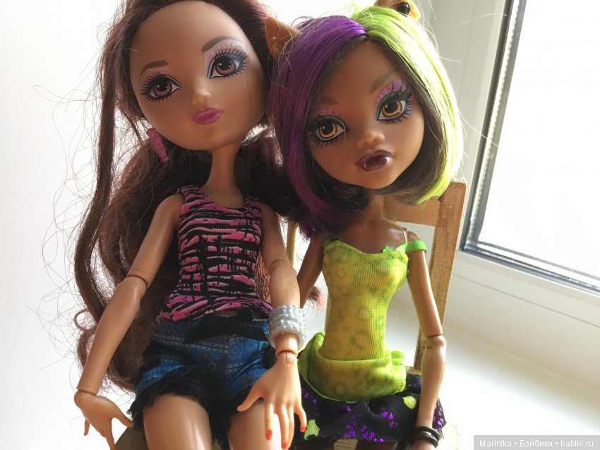 1. Слева «Новая» Toralei Stripe — Garden Ghouls Monster High, справа «до ребутная» Toralei Stripe Freak Du Chic (одежда от Гильды).