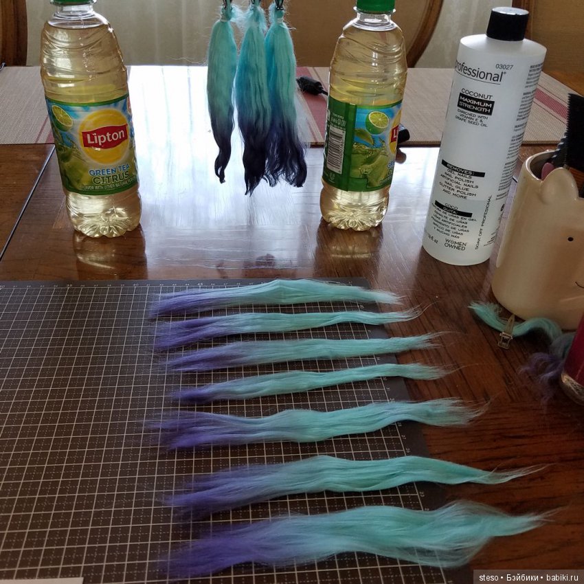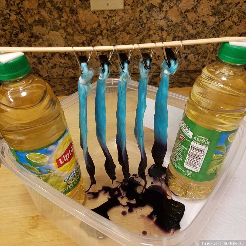 Парик делала так, сначала вычесывала нитки, затем собрала их в пучки на резиночки. Затем взяла краску для синтетических тканей, она бывает в порошке или жидкая. У меня жидкая. в общем разбавила ее в горячей воде, в маленьком стаканчике. затем намочила свой пучочек в теплой воде и немного отжала, кончик пучка, опустила в краску и подождала пока краска немного поднимется по пучку, когда она достаточно поднялась, я повесила ее на палочку что бы краска и вода стекли. Таким образом у меня получился градиент.