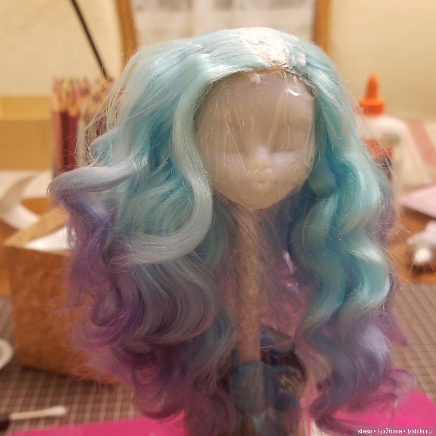 Начала я, свое обучение с париков из акриловых ниток. Мне это на столько понравилось, что я в течении недели сделала несколько париков во всех вариациях. Самое сложное для меня это было покрасить акриловые нитки так, что бы меня это устраивало. Тяжелее всего мне дались кудряшки, очень долгий и трудоемкий процесс, пряди накручивала на палочку, затем грела их строительным феном и только потом склеивала в пряди.