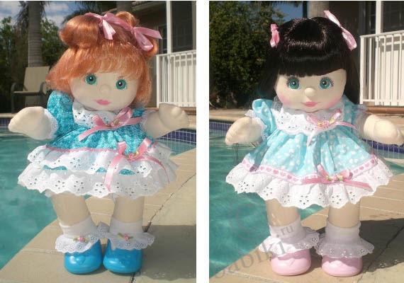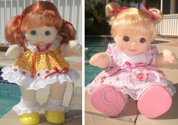Никого не оставят равнодушными такие милашки: «My child» от фирмы Mattel. Куколки полностью мягкие, даже личико. Они немного похожи на кукол Cabbage Patch. Одежда полностью снимается, туфельки из пластмассы. Куклы My child отличаются друг от друга цветом глаз, волос, прической — бывают с длинными волосами и с короткой стрижкой. Есть мальчики и девочки. Размер этой куколки 35 см.