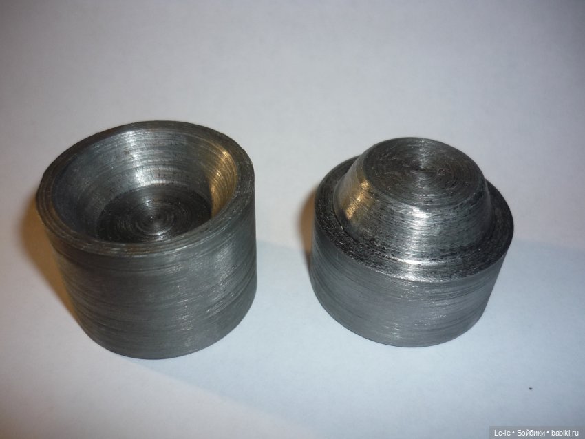 Посуда сделана из тонкого листа алюминия (старая линейка)). Муж выточил на станке такую матрицу (между этими половинками вкладывал лист и сильно бил молотком, потом выравнивал и обрезал края, шлифовал)