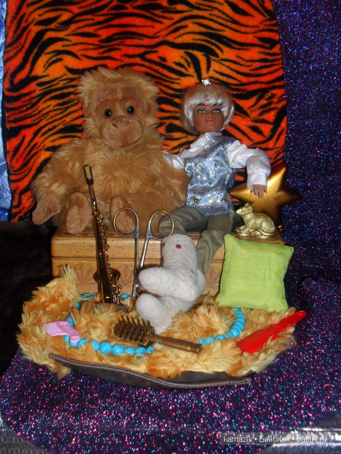 Принцев и принцесс я не признаю. Это детские мечты. А у меня образ конкретного персонажа. Современного. Фотографировала его как бы на конкурс, но когда уже были готовы кадры, то я поняла, что сильно много атрибутов. А должно быть только три, как максимум. Да и Зверев то уже не маленький, что бы у него были любимые игрушки зверушки. А на кадре и расчёски и саксофон и ножницы и обезьяна. Это Паолке и может даже Барби можно мишутку в руки дать. Это мило. Но не такому типу, как стилист.