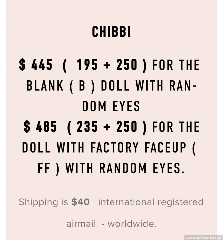 485 долл за куклу с мейком + 40 долл доставка (рассрочка 1ый платёж 235долл + доставка, 2й платеж 250 долл — после того, как Мирослава получит кукол).