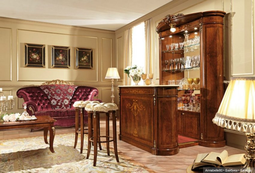 Мне хотелось большой, уютный, шикарный… Получилось, как водится, что получилось. В общем и целом я довольна, хотя можно было малость пониже. С другой стороны, стоять будет на ковре, так что ворс тоже надо учитывать. Диван сделан уголком со столиком. Это единый предмет. Натуральная замша! Специально для него заказывала, а уж как терзалась выбирая цвет!))) Теперь, начало положено! Следующий предмет, без которого я не представляю гостиную Счастливого Дома на костях, это барная стойка. Барная стой 1/12! Если я её сделаю, воздвигну сама себе маленький бронзовый памятник. На худой конец — бюст!