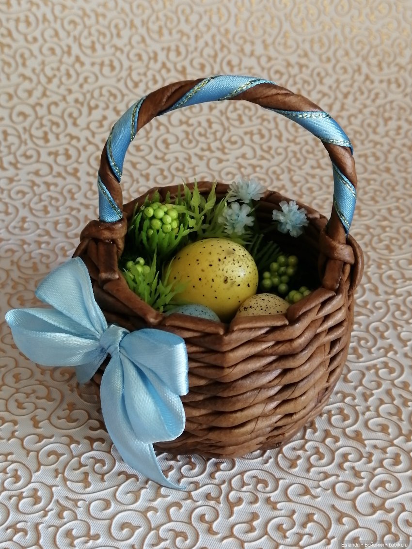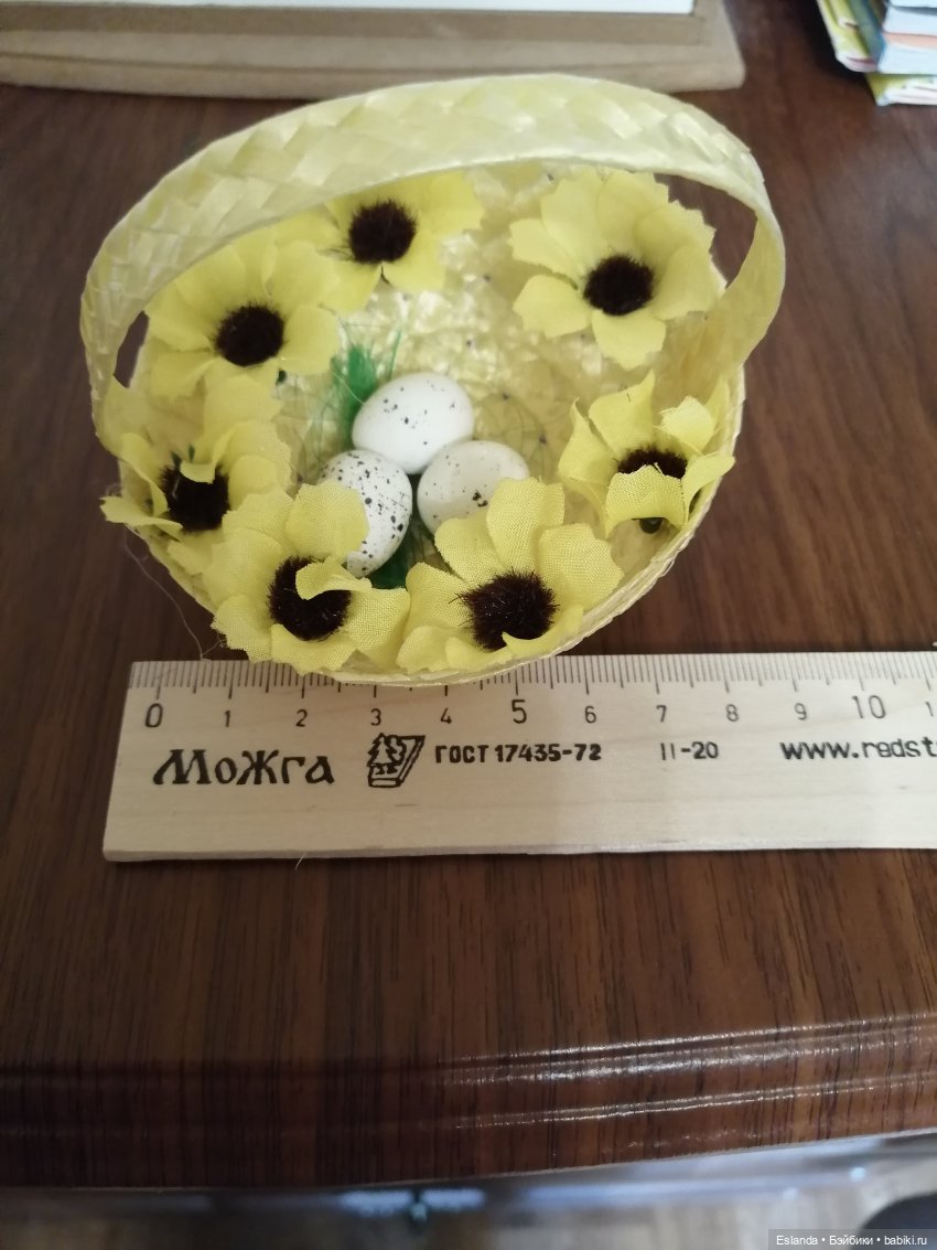 Часть декора я дома открепила с веток, мне нужно было наполнить корзиночки, которые купила у одного мастера, пасхальным декором на подарок. Вот почти готовая уже корзиночка, осталось немного украсить ленточкой корзину и можно дарить: