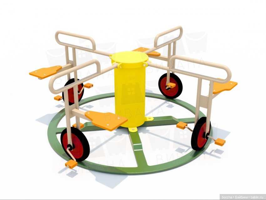 Мне на ум пришло пока две однотипных идеи — цирковое колесо, и старинный велосипед с большим и маленьким колесом.