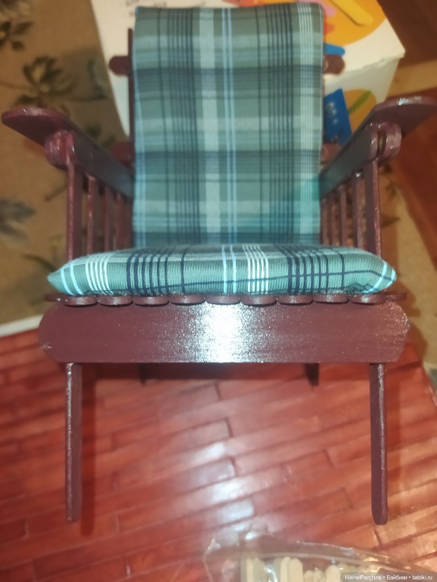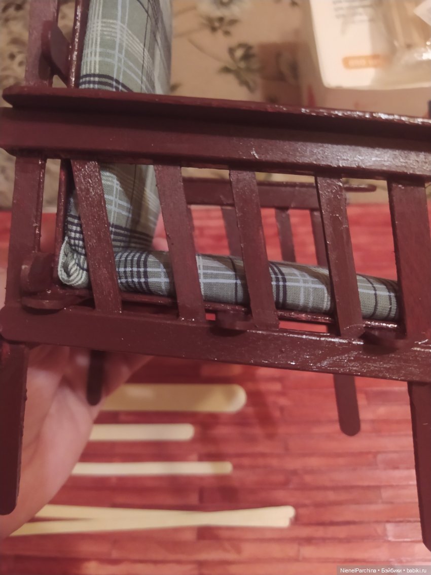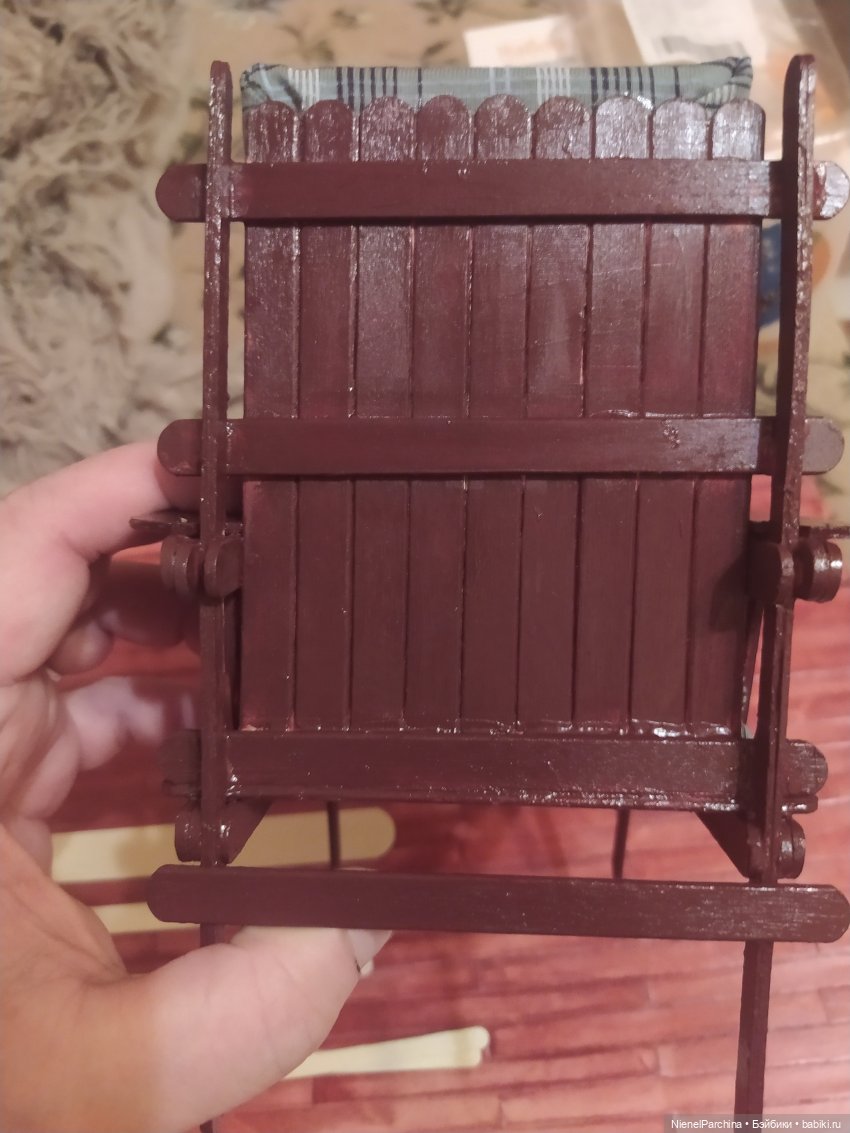 Конструкция простая, склеила из деревянных шпателей разного размера. Покрасила, сделала мягкую спинку и сидение.