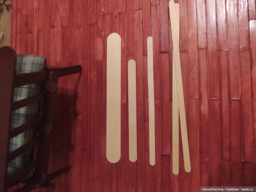 Длинные узкие 180мм на 6мм.так как они тонкие я их склеила между собой. Это задние ножки-4 палочки.