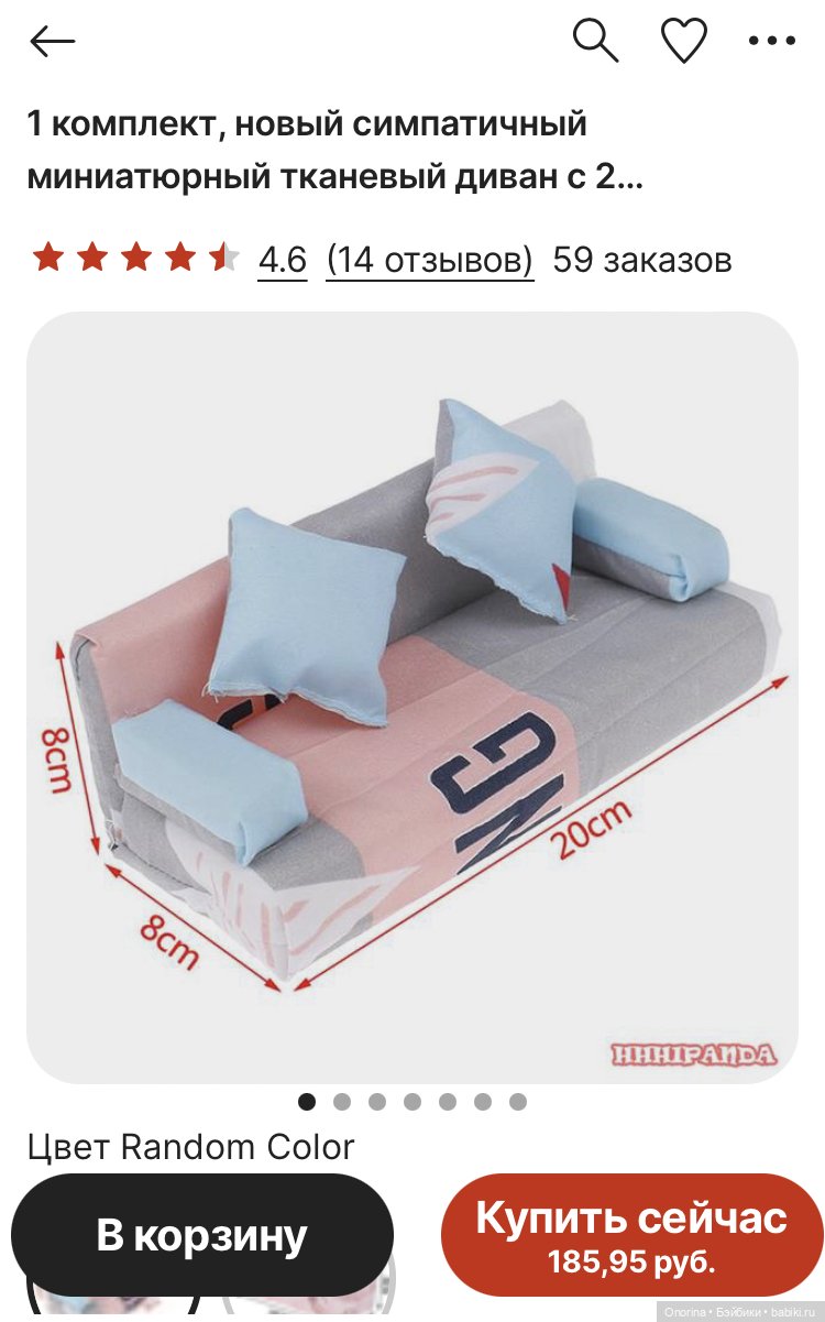 С Барби показать не могу, я же не купила тот барби-вариант. У меня и Барби-то ни одной нет, куда мне его. И что-то не сообразила сфотографировать. Там был диван, 2 кресла и столик. Просто в прозрачном пакете таком плотном и шнурком завязано. Цвет пестренький. Стоило 1000₽. Поискала сейчас в интернете — нет похожего.