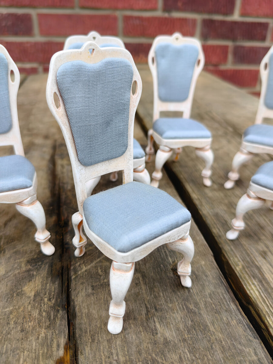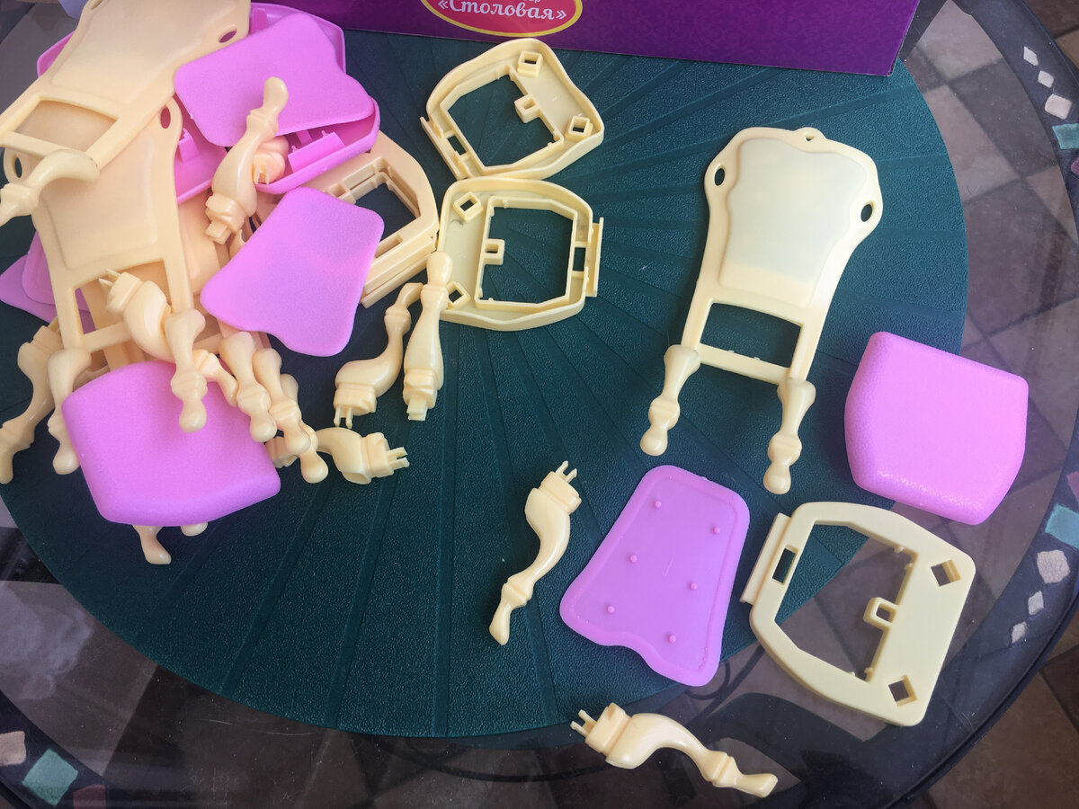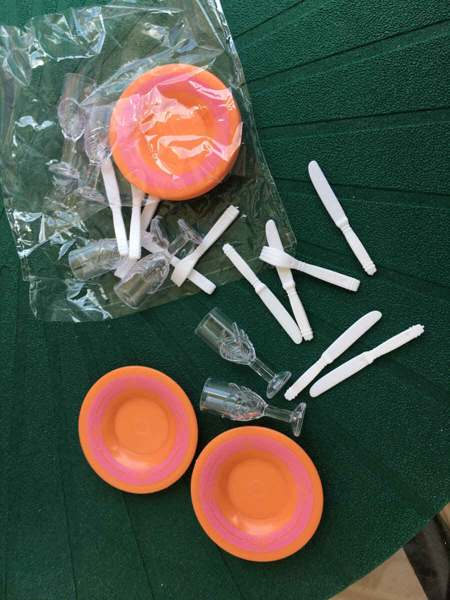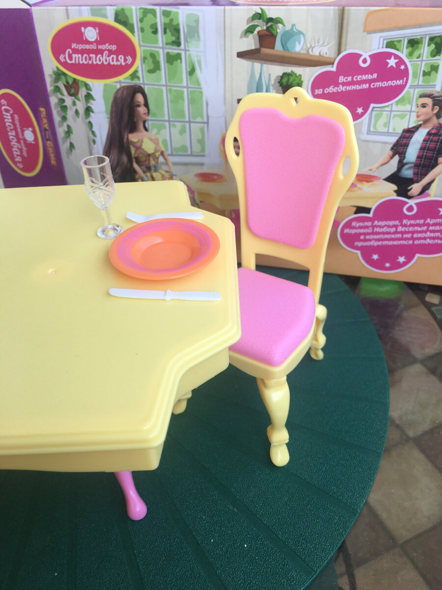 В июле 2021г я прикупила обеденный гарнитур для кукол в Фикс Прайсе за 199р тогда еще. Была у меня мысль переделать его и посмотреть что получится. И как-то рьяно я взялась за дело и процесс пошел быстро. Благо весь набор прекрасно разбирается и его очень удобно красить и обтягивать тканью. Так что гарнитур оказался совершенно идеален для моих целейВ наборе так же шли тарелки, приборы и совершенно прекрасные а-ля хрусталь бокалы.
