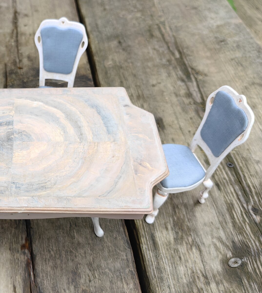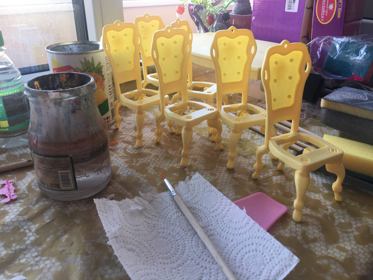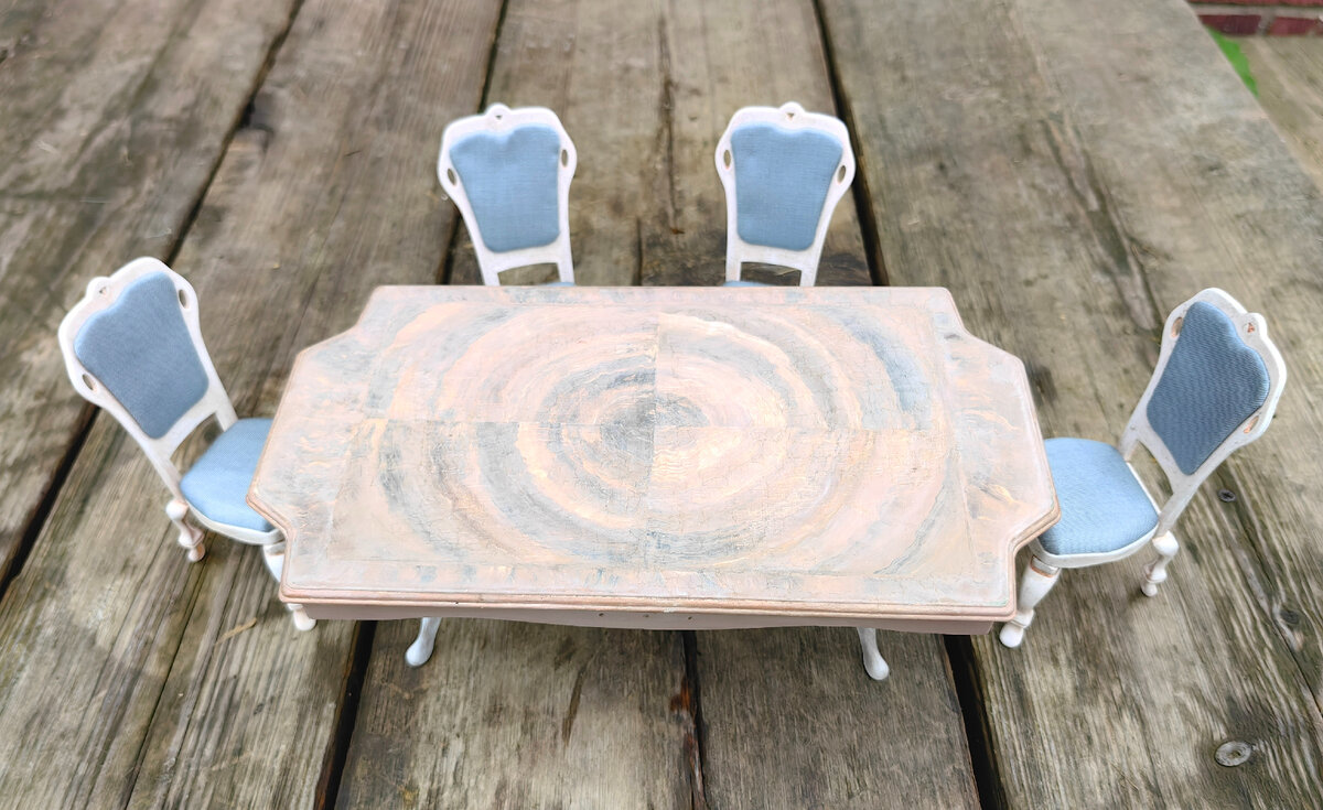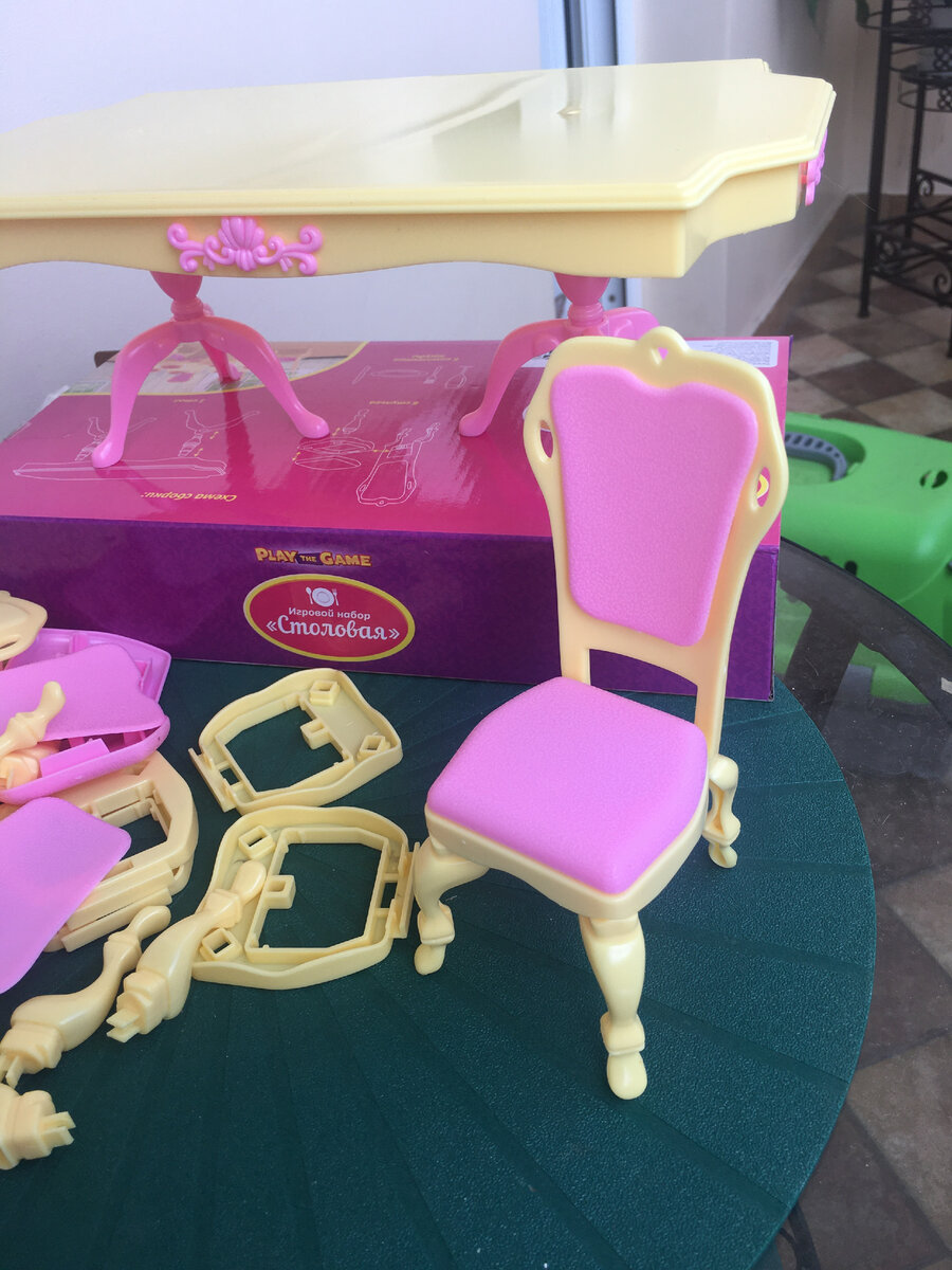 В июле 2021г я прикупила обеденный гарнитур для кукол в Фикс Прайсе за 199р тогда еще. Была у меня мысль переделать его и посмотреть что получится. И как-то рьяно я взялась за дело и процесс пошел быстро. Благо весь набор прекрасно разбирается и его очень удобно красить и обтягивать тканью. Так что гарнитур оказался совершенно идеален для моих целейВ наборе так же шли тарелки, приборы и совершенно прекрасные а-ля хрусталь бокалы.