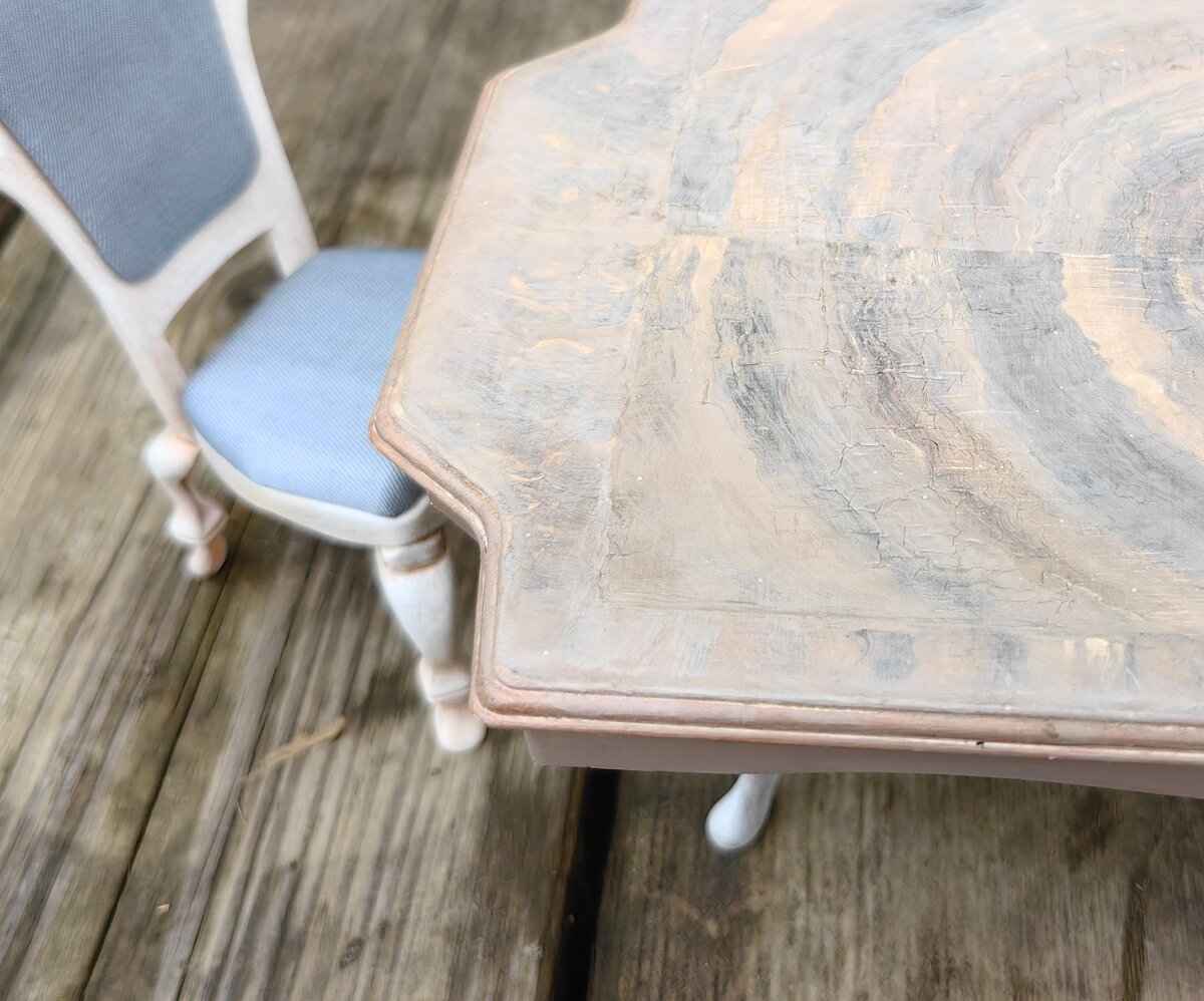 И вот споткнулась я об стол. Намудрила со столешницей. Слой краски оказался толстым и Цапон разорвал его, образовав большие неприятные бугры и волны. На этом я и отложила аж на 2 года всю свою переделку, пока не достала этим летом все свои недоделки, чтобы посмотреть что тут можно исправить и сделать. Стулья меня по-прежнему устраивают. А вот стол совсем нет.