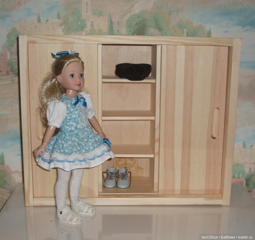 В предыдущих публикациях я предлагал вашему вниманию кукольную мебель — полки для хранения и одновременно экспозиции кукол, последняя из которых имела отделение для хранения кукольных аксессуаров. Сегодня предлагаю вам посмотреть на мою новую модельку шкафа — купе для хранения кукольных нарядов, обуви и прочего…