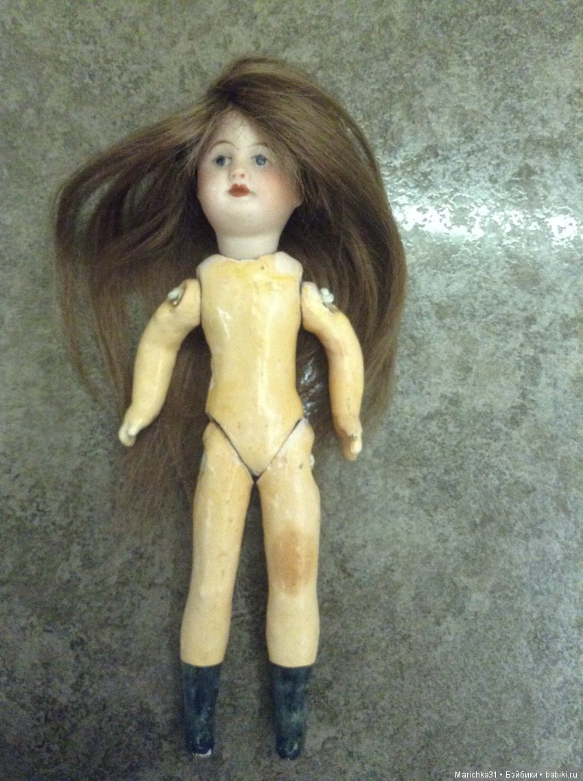 При этом я слабо представляла, что делать дальше. Пообщалась с продавцами антикварных деталей, но нужных ног и рук для моей миньонетты не было. Жалко стало куколку, и тогда нашла для нее ножки и ручки от другой дешевой китайской куклы. Паричок тоже нашелся неизвестного происхождения.