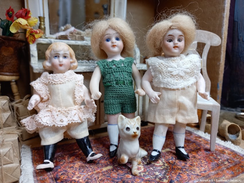 Сегодняшняя подборка посвящена миниатюрным антикварным немецким куклам из фарфора. Так называемым All bisque Doll, с номером на спине 36 in 8 Germania и без номерным. Их приписывают Кёстнер, но доказательств не приводят. Они часто встречаются на аукционах большими группами, в национальной одежде, костюмчиках, в коробочках с самодельным приданным, в разных образах. Их интересно рассматривать, молд 36 выделяется из других кукольных лиц, я его про себя называю нос кнопочка. Рост 9 сантиметров, цельно отлитое тело с головой, стеклянные глаза, без прорисованных ресниц, ручки согнуты в локте, ноги в гольфах, туфли с каблучком. Попробуйте найти всех не молдовых куколок, они выдают себя иными носами и нарисоваными ресницами.