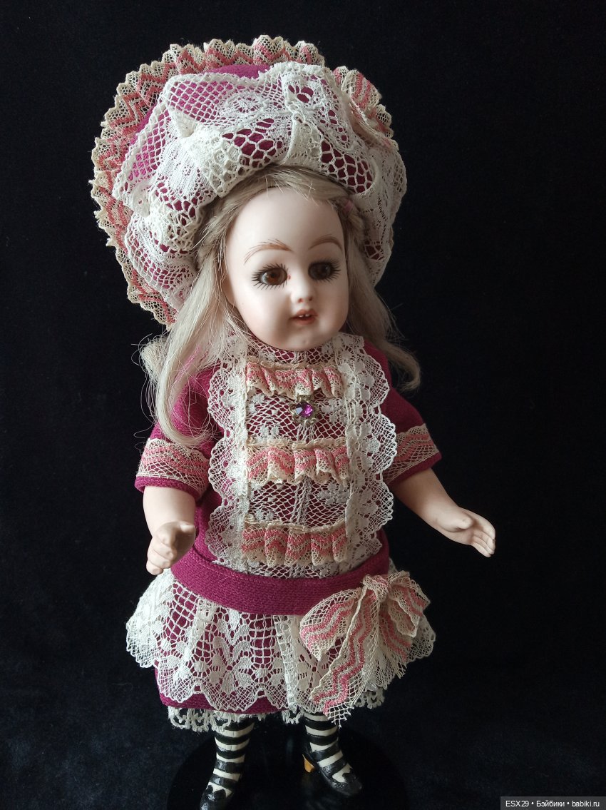 Недавно обратила внимание на таких малышек, даже купила две антикварные миньонетты и три реплики, теперь неспешно обшиваю их) Вот одна готова показаться)) Это реплика с антикварными глазками, ростиком 18 см.