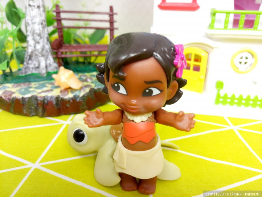 И не ошиблась! Какая же она мимишная! Малюсенькая! Хорошенькая! А какая фотогеничная! Есть Машка в кармашке. А у меня будет Моана из кармана! Итак, знакомьтесь: крошка Моана, рост 5,5 см. Волосики молдированные у нас. Заколочка в виде цветка. Ножки, ручки, голова крутятся. Бусики и юбочка снимаются. Бусики закреплены заводской резиночкой, а вот юбочка резиновая с плотным поясом, и если я захочу её снять, то нужно приложить некоторое усилие. В комплекте с девчушечкой шла маленькая черепашка и морская раковина. Всё резиновое, приятное на ощупь. И сразу получился такой мини обзор на куколок до 8 см, которые у меня живут. Земляничка 8 см, Капелька 6,5 см. Моаночка оказалась самой маленькой из них.