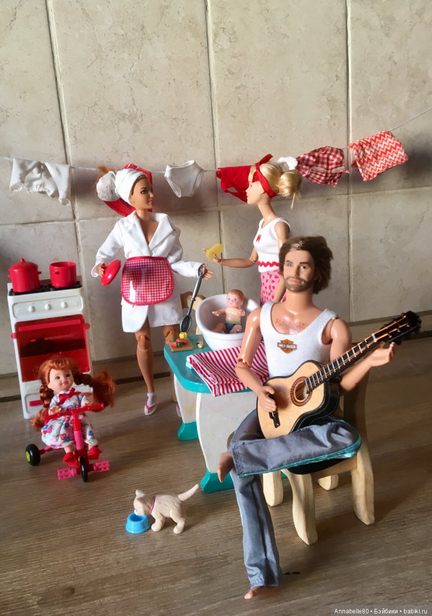 Мне несоответствие времен не бросилось в глаза, коммуналки существуют десятилетиями, попробуй сними любимый плакат бабули) скорее несоответствие фигур кукол и макияжа девчонок, очень инородно смотрятся. Очень понравилась посудка!