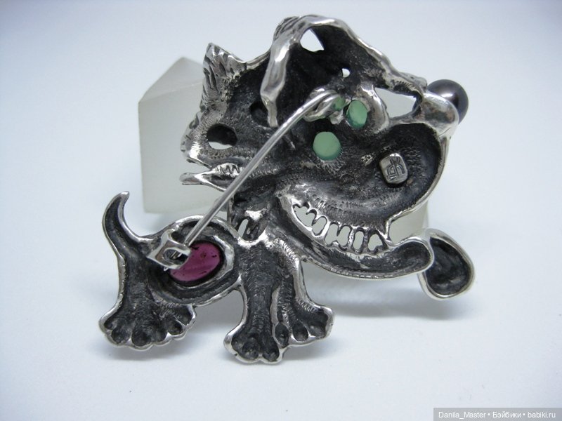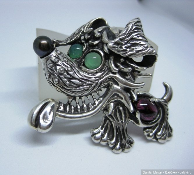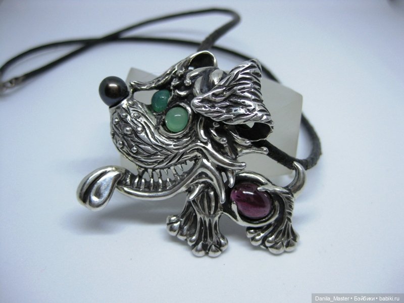 Глаза — кабошоны хризопразы, тельце — кабошон гранат родолит. Нос — чёрная жемчужина. Все камни — натура. Серебро 925