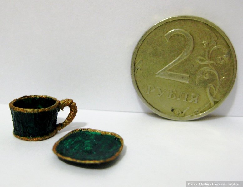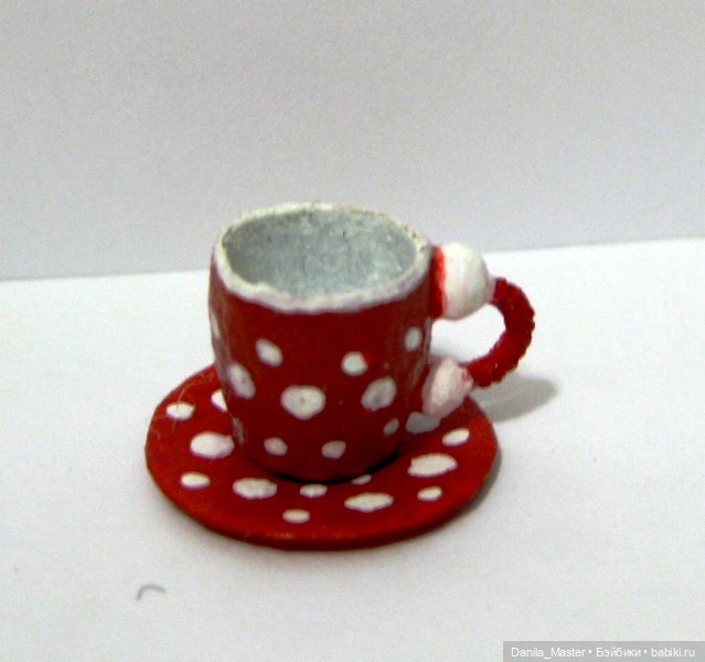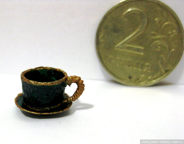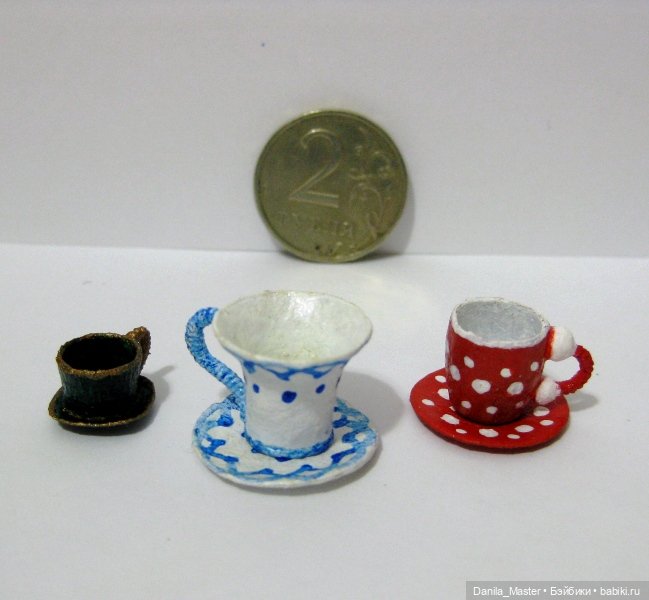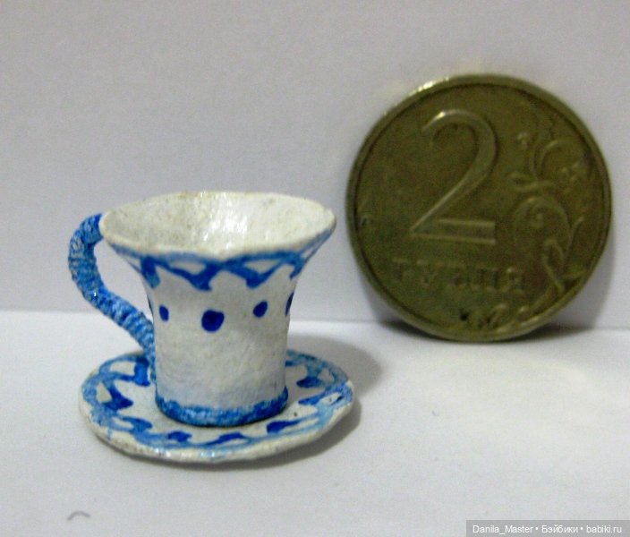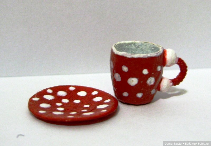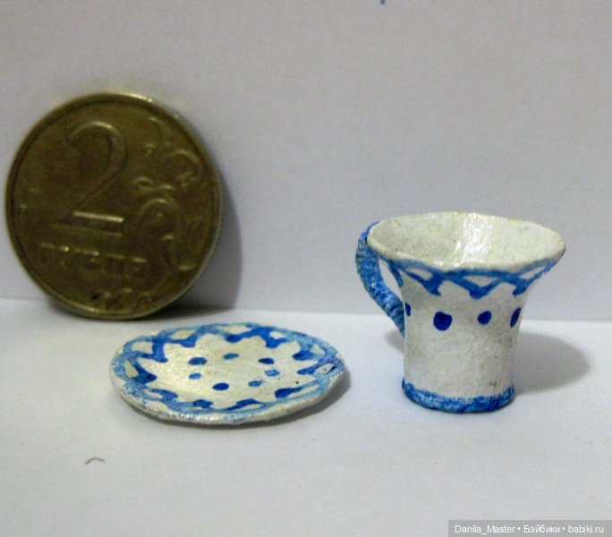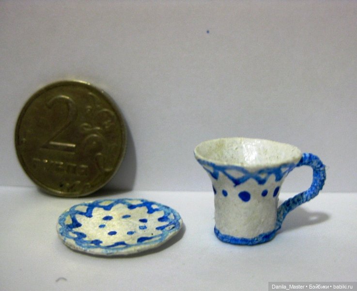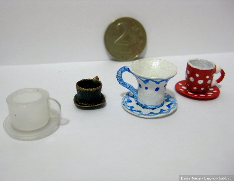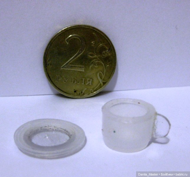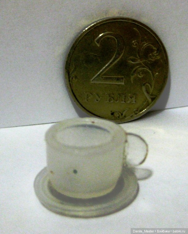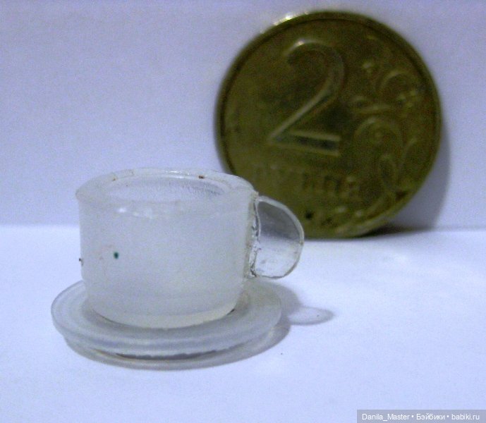 Прозрачная чашка и блюдце — разреданная пробочка от настойки какой-то аптечной, календулы, наверное — от пробочки отрезал колечко и подклеил кружок из прозрачного тонкого пластика — блюдце, к самОй пробке приклеил прозрачного же пластика кусочек типа ручки.