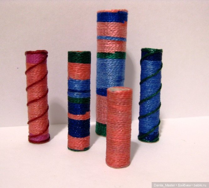 Бумага — ватман. Иногда с напечатанным принтом. Иногда использовала переводилки для декора, или декупаж — фрагменты салфеток. Объемные «обручи» — х/б шпагат (тонкий) наклеивала на ПВА. Ручки — из зубочисток, можно из полимерной глины.