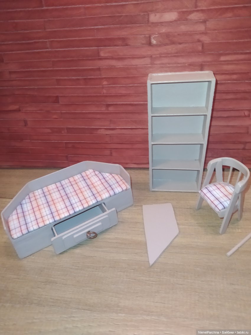 Создалась обстановка для комнаты отдыха второго этажа маяка. Диван, стул, шкаф и стол будет встроенный. И ещё я рада что у Ангуса появилась обувь. Рылась в скарбе и нашла пластиково-резиновые туфельки от старого дочкиного пупсика, розовые)). Оказались на милиметр меньше, я их в кипяток и надела, покрасила в чёрный. И вот Ангус уже обут)). Дальше фотки мебели.