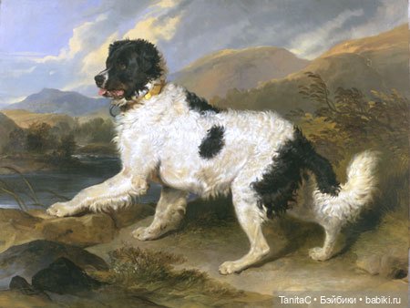 Для справки, это исчезнувшая порода того времени — чёрно-белый ньюфаундленд, в настоящее время породу востоновили по изображениям с картин.