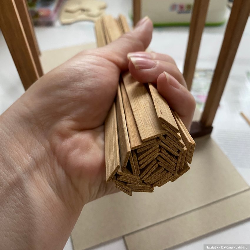 Короче, подготовила основу для «будки», как раз пригодились кирпичики для равномерной высоты. Палки попилила по 40 см. зашкурила и покрыла морилкой «орех». Раздербанила китайскую салфетку — получилась куча досок. Основа заложена, минут 40 пролежала под прессом 😏 Передняя стенка тоже уже почти готова.