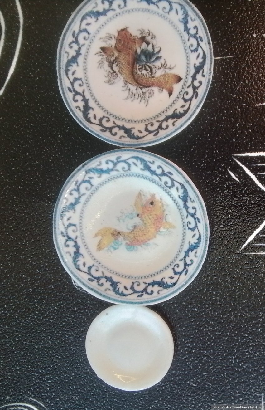 Те, кто увлекается миниатюрой, стараются обеспечить своих кукол не только жильём, но и всем тем, что есть в настоящем доме. Знаю, что многие собирают коллекцию фарфора от Ройтер. У меня есть только одна тарелочка, и та была подарена. Но моим кукложителям не приходится жаловаться на недостаток фарфоровой посуды. Как оказалось, в продаже можно найти много красивых наборов и просто отдельных тарелочек. Что я с большим вдохновением и делала.