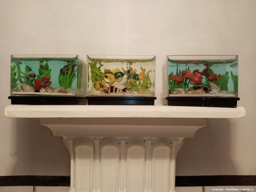 Я очень давно хотела купить себе аквариум для кукольного интерьера, но жаба душила. Потом я загорелась сделать аквариум самой, это же интересно, тоже очень долго вынашивала идею. Решилась, правда со смолой работала первый раз, под руками только УФ была, доча одно время увлекалась, поэтому не кидайтесь тапками те, кто умеет это делать, я про то, что пузыри нужно доставать вообще вспомнила в самый последний момент, когда большую часть уже просушила, и о том, что сначала хорошо бы труднодоступные места заполнить, а уж потом заливать тоже поздно вспомнила. В общем, имеем нечто кривенькое слоеное с кучей пузырей. Но я все равно довольна и в следующий раз обязательно учту ошибки.