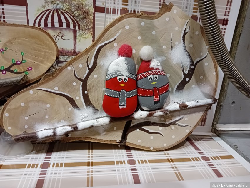 Был уже поздний вечер, когда пришла пора запорошить всё «снегом». Полусухой кистью-щетиной делаем брызги краски, несколько точек можно нарисовать в разных частях среза — это крупные хлопья снега летят в зимнем лесу.