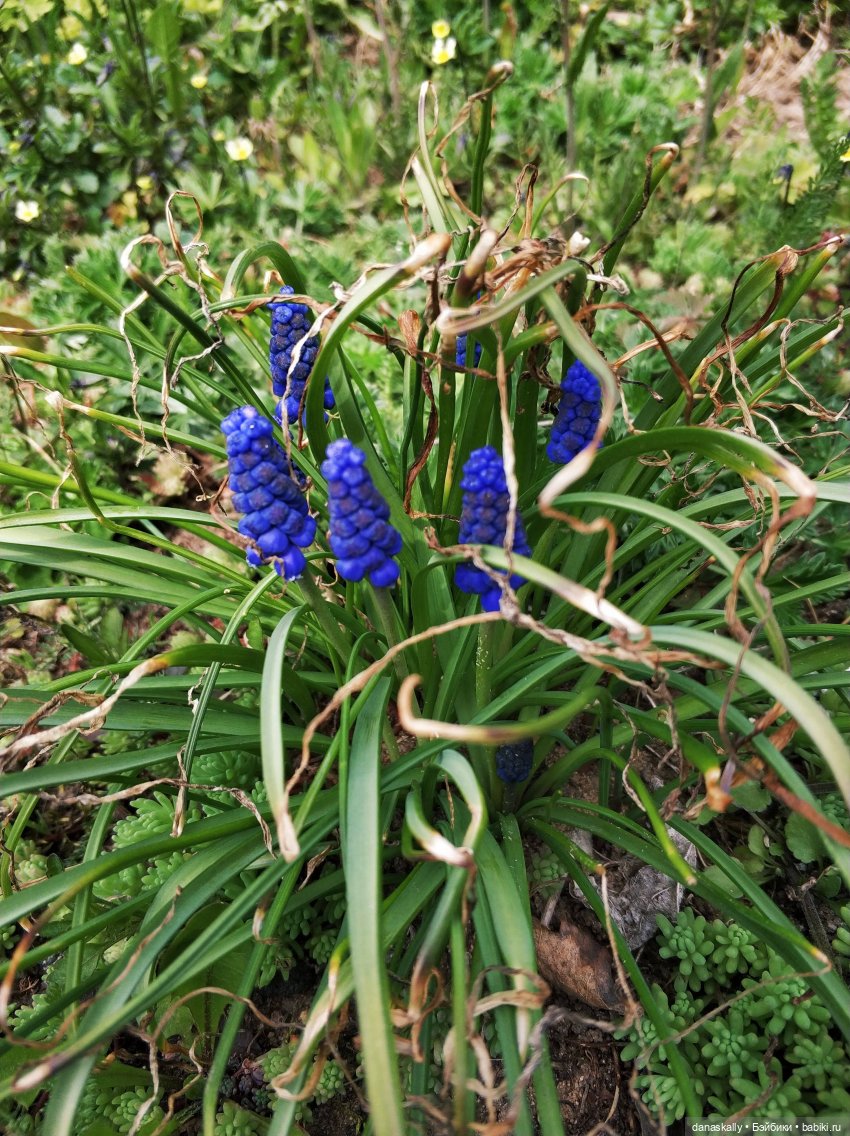 Называется этот цветок — «мускари» (за мускусный аромат), в Англии его зовут «виноградным гиацинтом» за сходство соцветий с виноградной гроздью, французы называют его «земляной сиренью», «мышиным гиацинтом» он зовется за свой миниатюрный размер, а «гадючим луком» его прозвали за сходство луковички с настоящим луком и ядовитость. Так что просто любуемся, не трогаем особо.