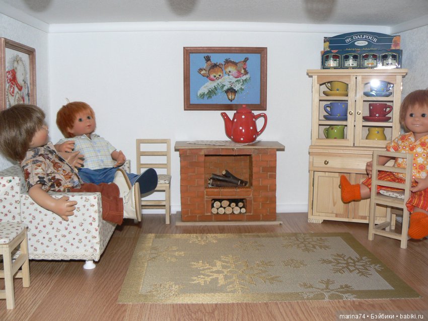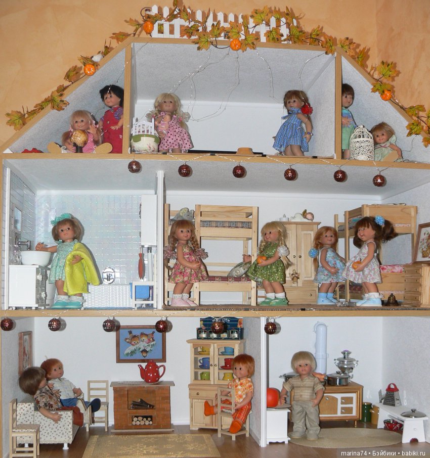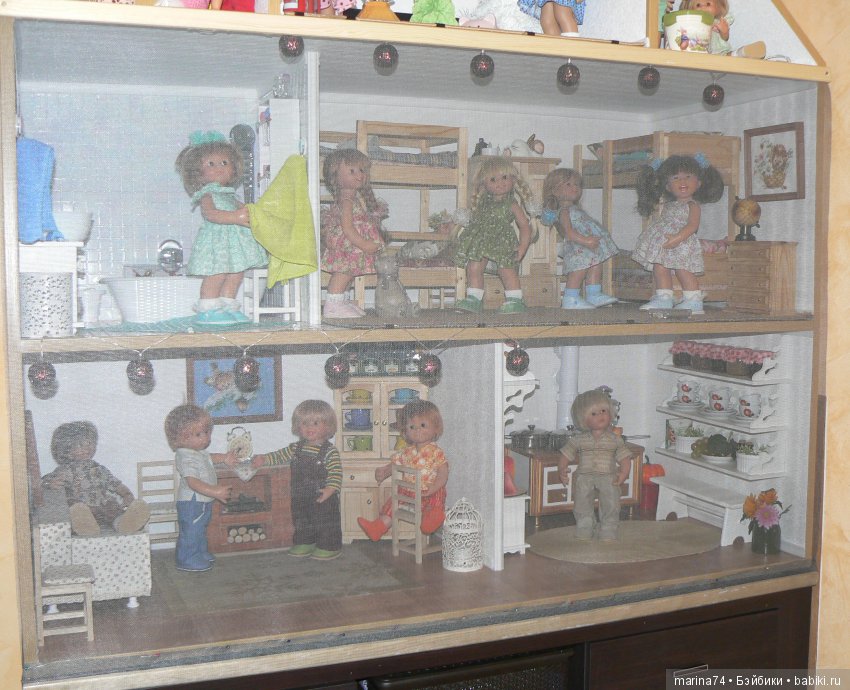 У нас первый домик был на 50 см короче и на этаж ниже)) Домик находится в маленькой комнатке 3*3м. В этой комнате нахожусь только я с куклами и моя живность))) Такое место для релаксации и рукоделия) К домику все привыкли, как-то его размеры «не давят»)))