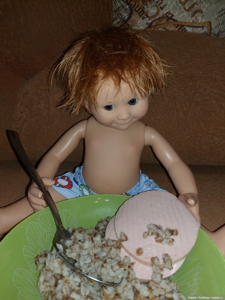 А Денька так аппетитно кушает гречку с колбаской, что мне моментально захотелось то же самое! И срочно!