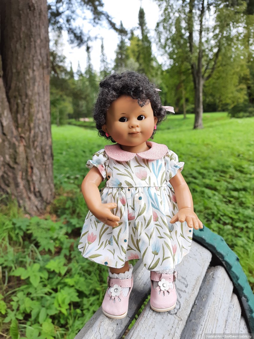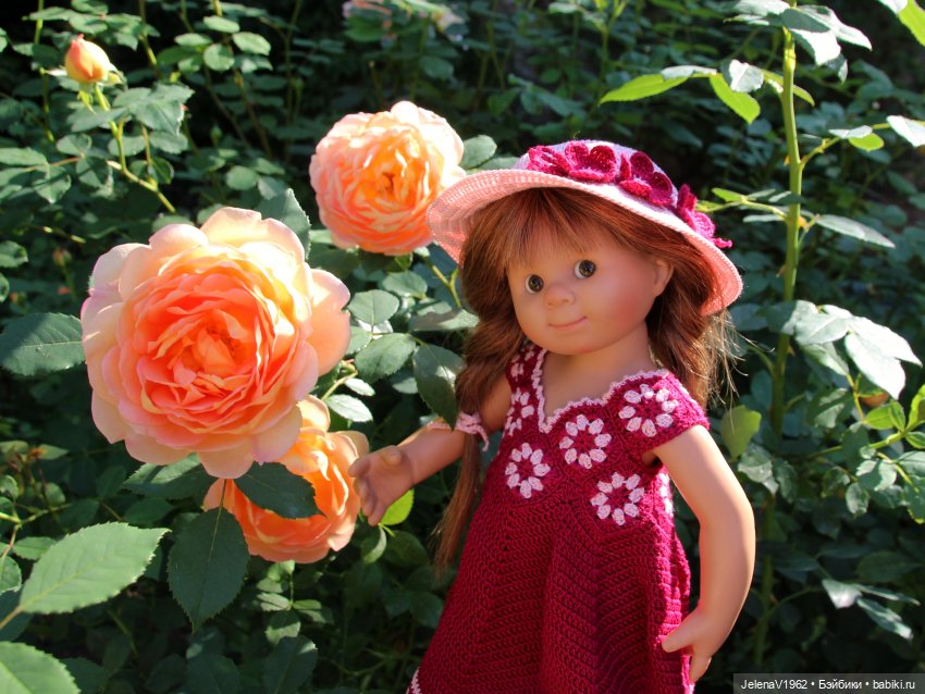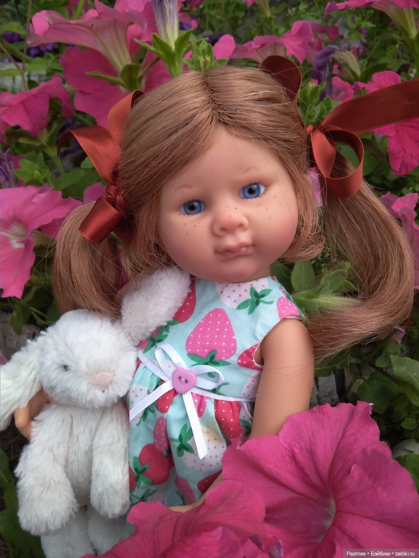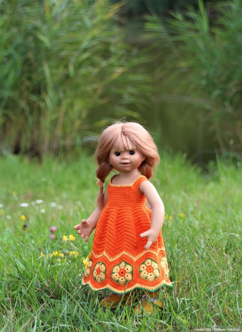 Рыжулька Фрида. У неё тоже рисунок на платье, напоминающий ромашки, только лепестков побольше и покрупнее.