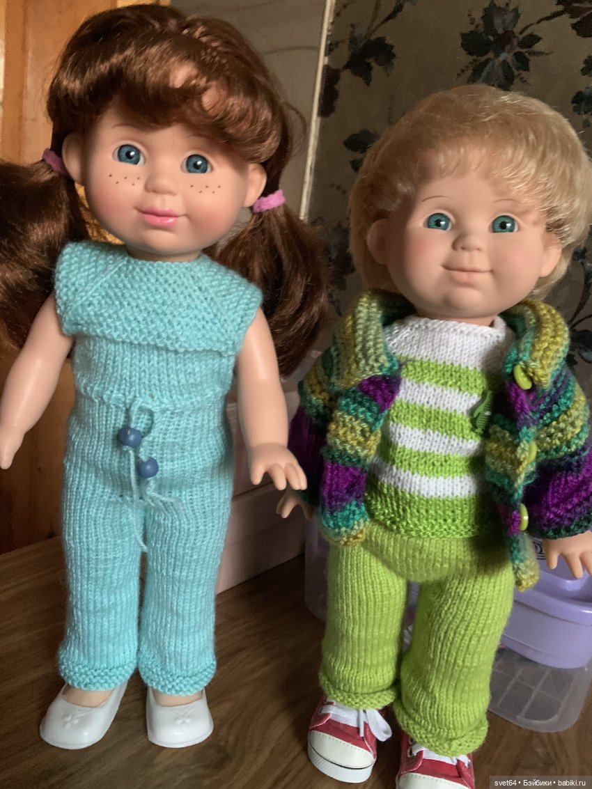 На фото они вдвоем и с еще с одним солнечным мальчишкой. На этом фото я уже связала ему новую одежку. А на фото с Митей и с веснянскими малышами рыжик еще в старой одежке…Потом приехала веснянка и ее братишка. Покупала их на сайте бебики. Приехали они без одежки и поэтому фотографироваться в полный рост не хотят. Но носик показали. Попросили хоть какую-то одежку. В планах сделать нечто грандиозное, но…