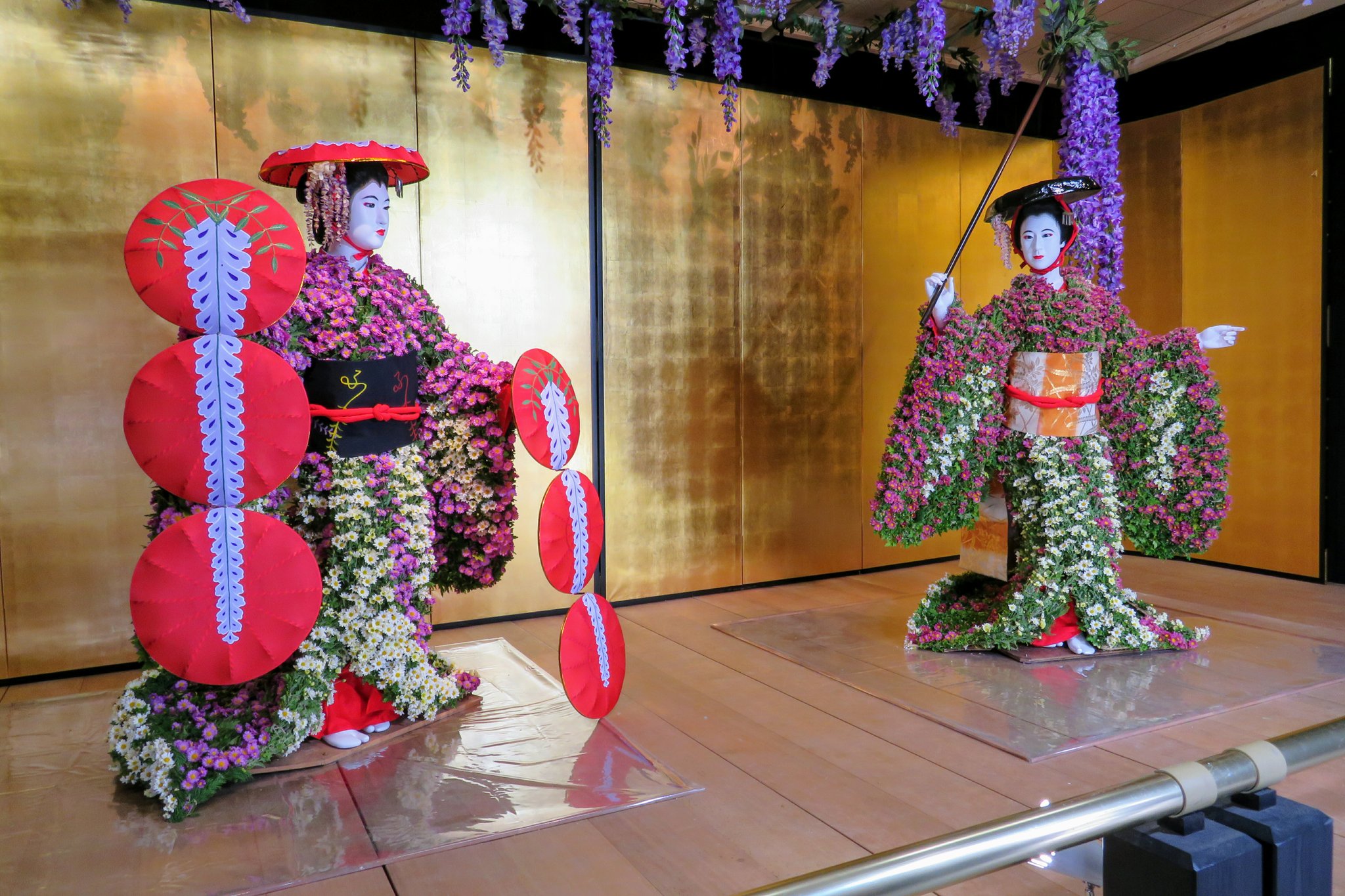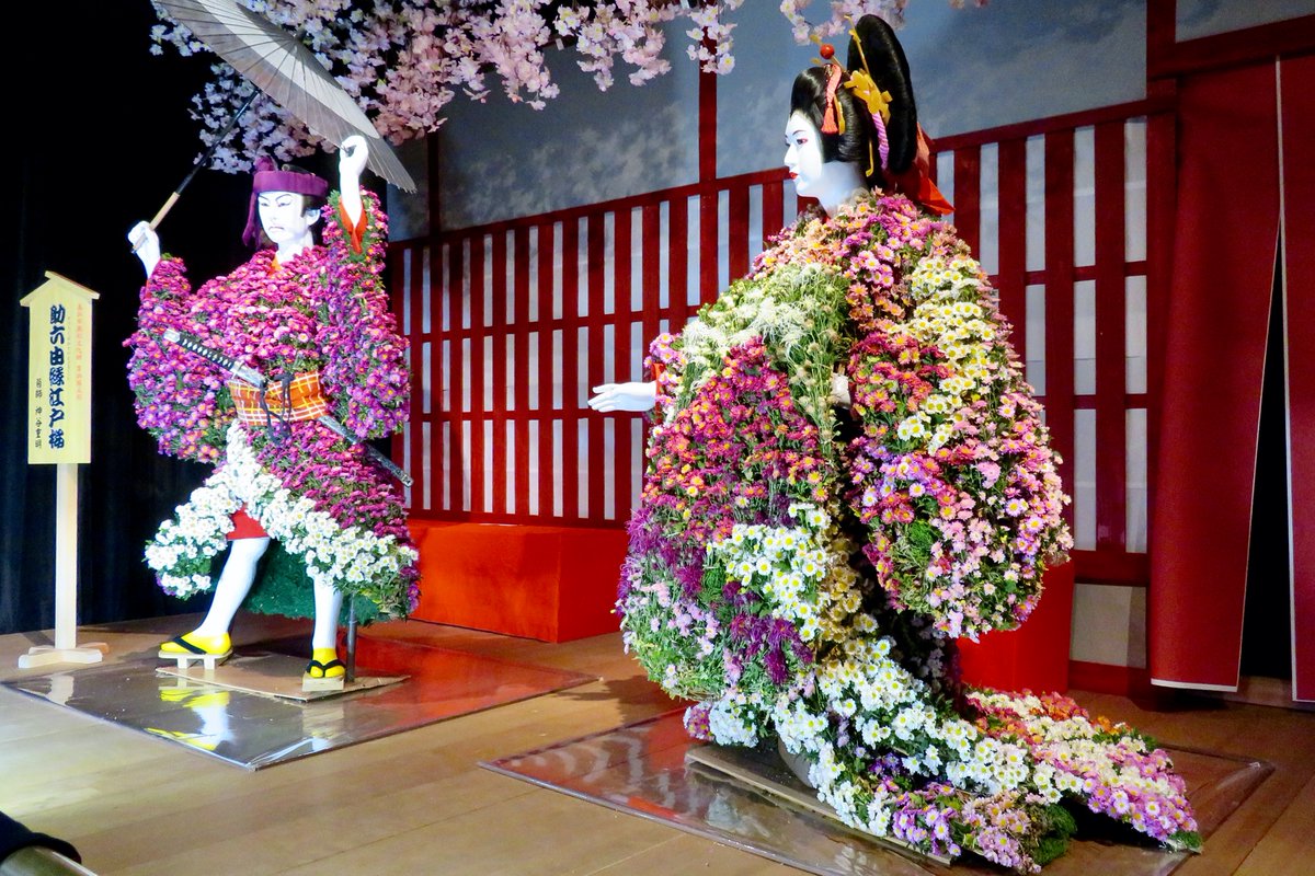 Хотя хризантемы считаются основными цветами, служащими одеждой кукол, но могут быть и другие. Чтобы одеть кукол в человеческий рост в костюмы из живых хризантем трудится много мастеров этого искусства. К каркасу закрепляют сотни цветов с корнями, которые предварительно заворачивают во влажный мох. В заключении куклы украшают тканями.Создание кукол из хризантем – это высокооплачиваемое искусство. Их нельзя переносить с одного места на другое, так как сразу потеряют все свое очарование. Поэтому мастеров вызывают на дом. Они устанавливают их возле домов, в парках, и садах.