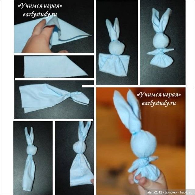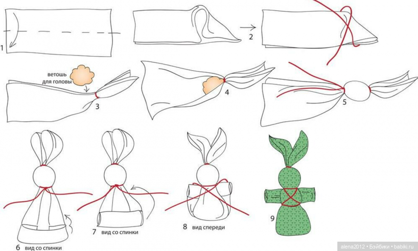 Столбик сверху покрываем квадратной белой тканью, складываем треугольником. Формируем голову, обматываем по шее красной нитью. Формируем ручки. Края подгибаем вовнутрь, фиксируем нитью;