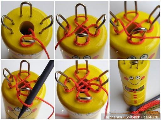 я в детстве таких много делала, брала у папы отрезок трубы см 10 и по краю гвоздики прикрепляла, уже не 4, а 10, шнурок был шире и я так куклам носки вязала, только без пятки. Не хватало ума ряд на пятке вязать не по кругу, а в прямом и обратном направлении.