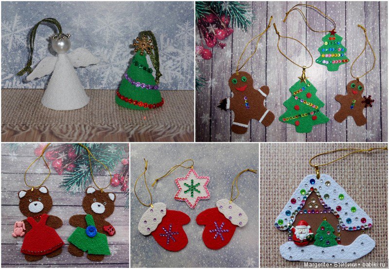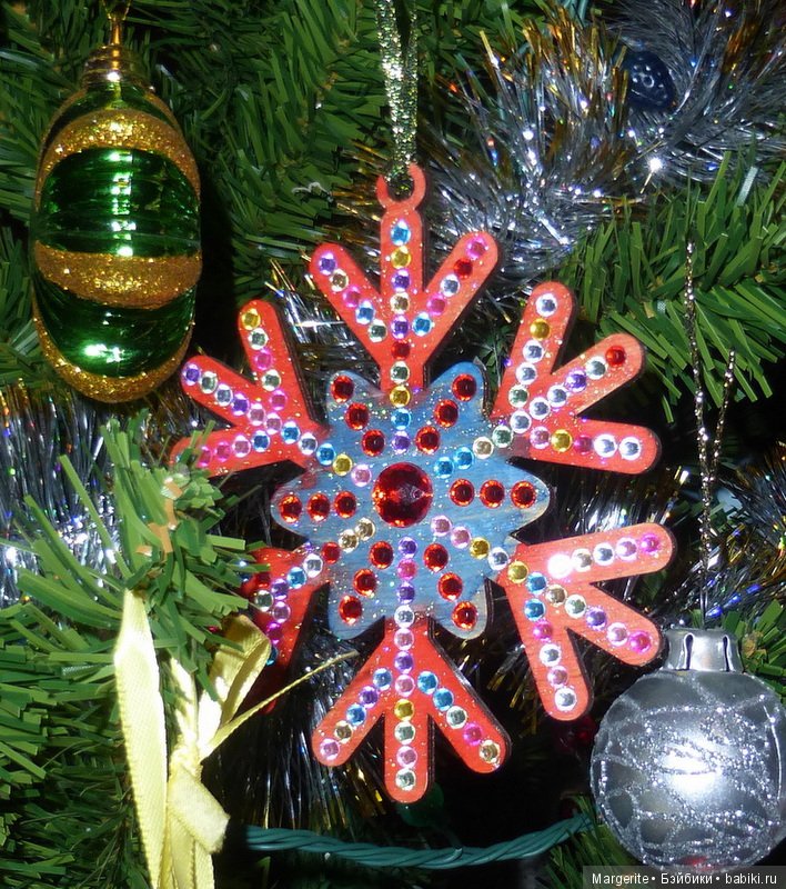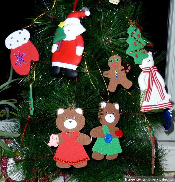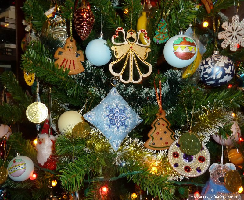 На этой фотографии из самодельного есть пряники, вышивка крестом, вышивка искусственным жемчугом и стразами, декорированные фанерные игрушки и раскрашенные шарики из фикс-прайса :)